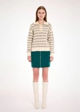 Knitss’e özgü zarif triko örgü tekniklerini stil sahibi dokunuşlarla tamamlayan enine çizgili kazak, sonbahar-kış kombinlerinize ayrıcalık katar. Düğmeli yaka detayının saç örgüsü desenle buluştuğu dokulu kazak, pamuk ağırlıklı İtalyan iplik içeriği ile de konforlu ve uzun ömürlüdür. Özgün, şık ve rahat bir kadın giyim stili için dolabınızın favori parçalarından olmaya adaydır.