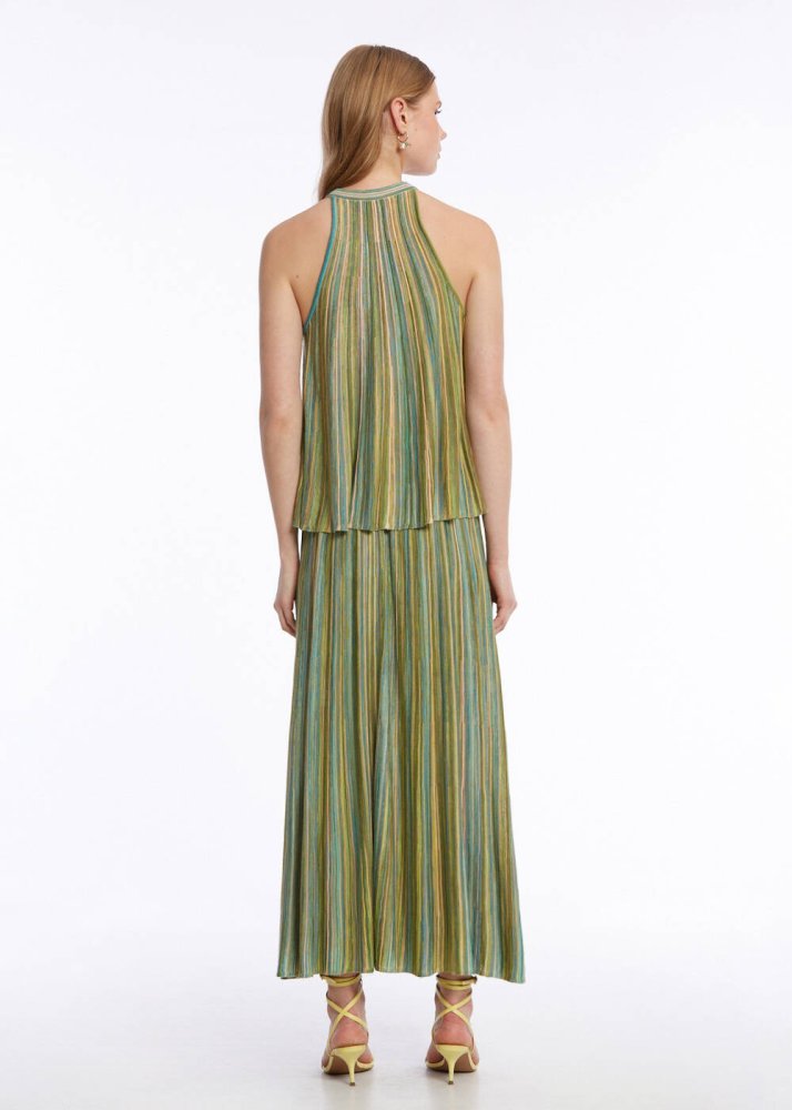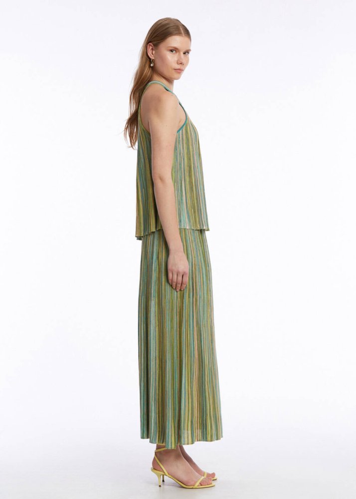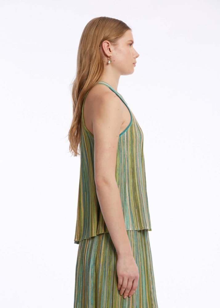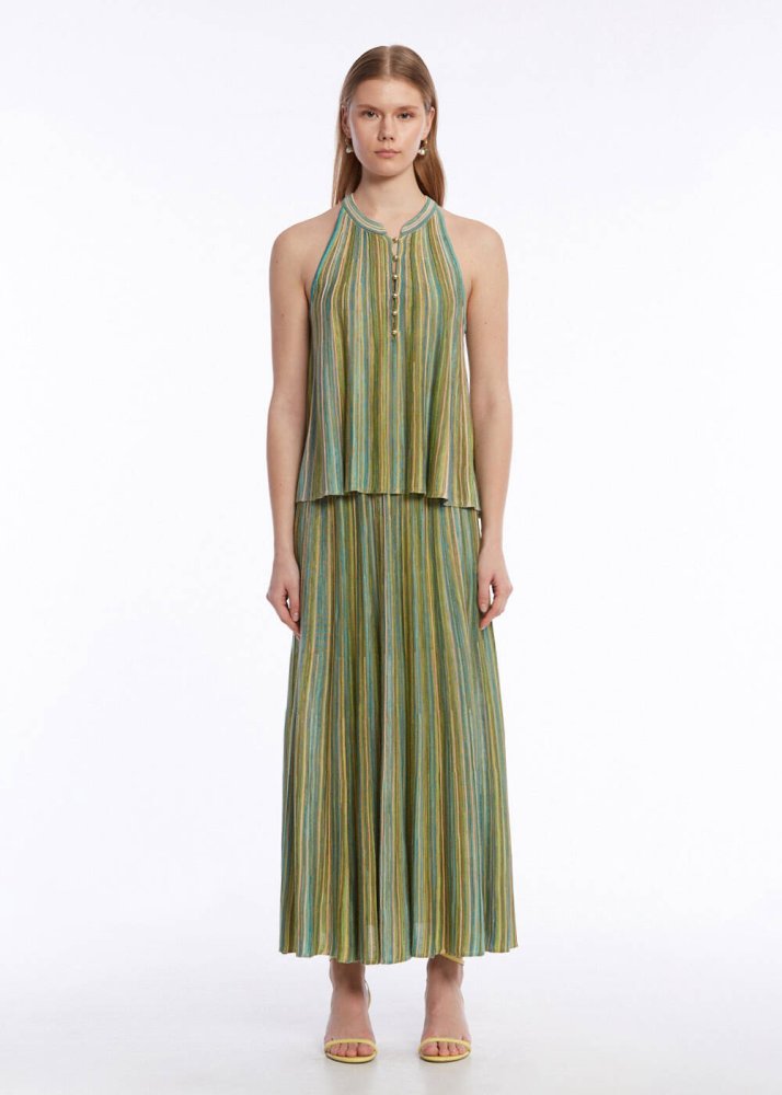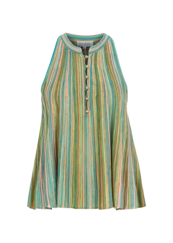 Yeşil renk bloklu çizgili kolsuz triko üst, düğmeli yaka detayı ve çağdaş stili ile sofistike giyim zevkini müjdeler. Konforundan ödün vermeden şık giyinmeyi bilen Knitss kadınları için üretilen bu özel triko üst, geri dönüştürülmüş İtalyan iplik içeriği ile sürdürülebilir modayı yazlık kadın kombinlerine taşır. Rahat kalıbı, hafifliği ve benzersiz şıklığı ile yazlık gardırobunuzun en özel parçalarından olmaya adaydır.