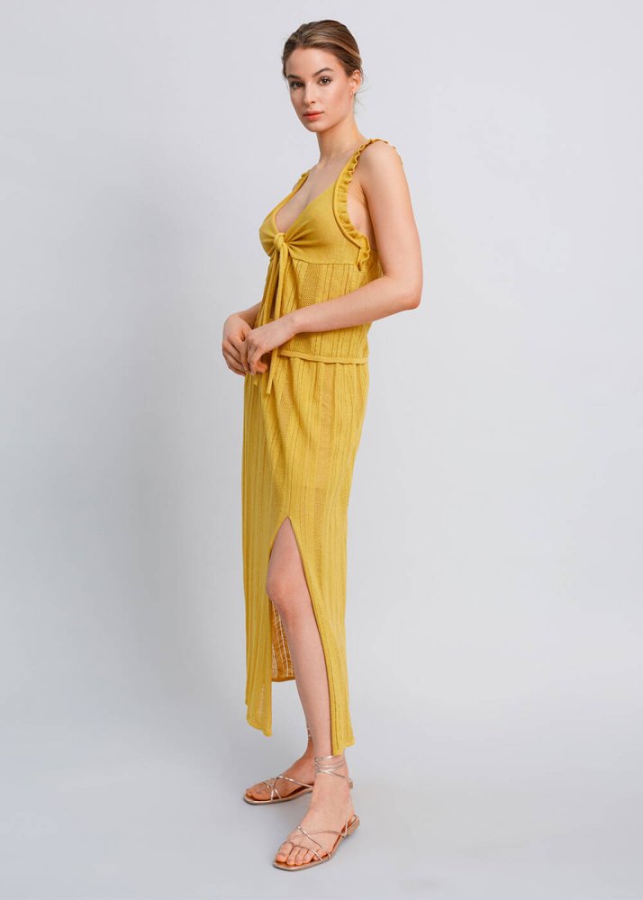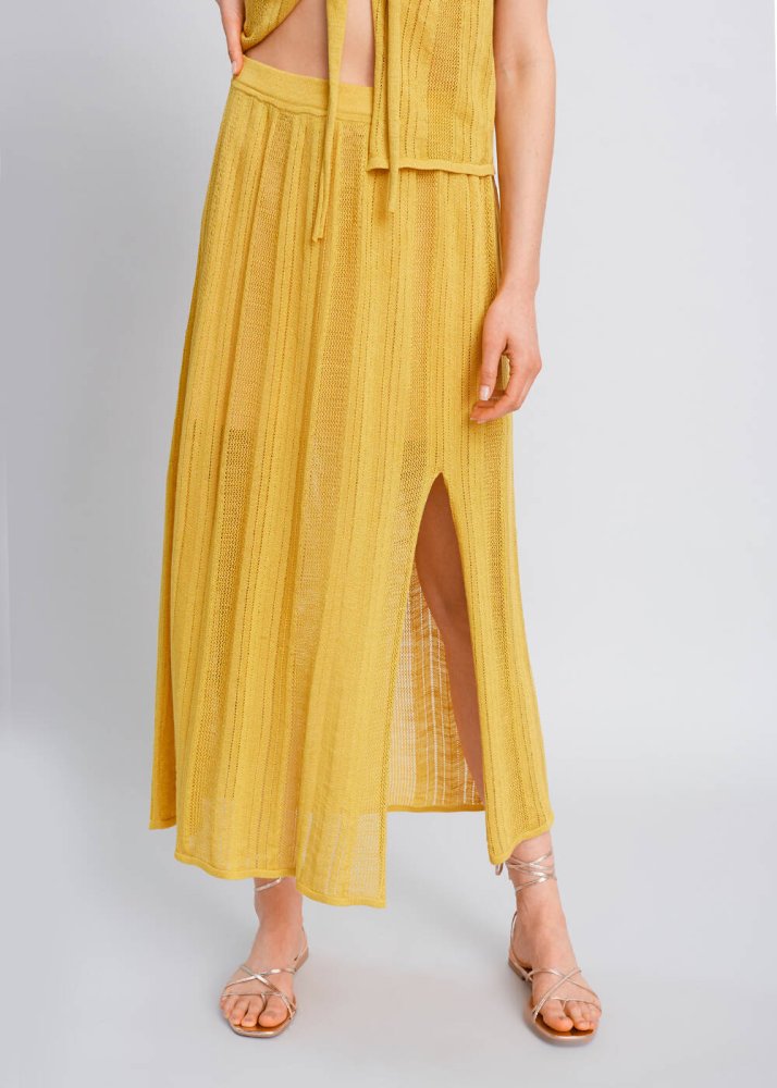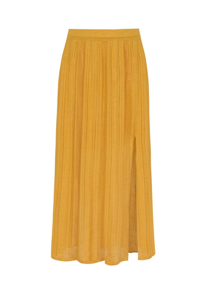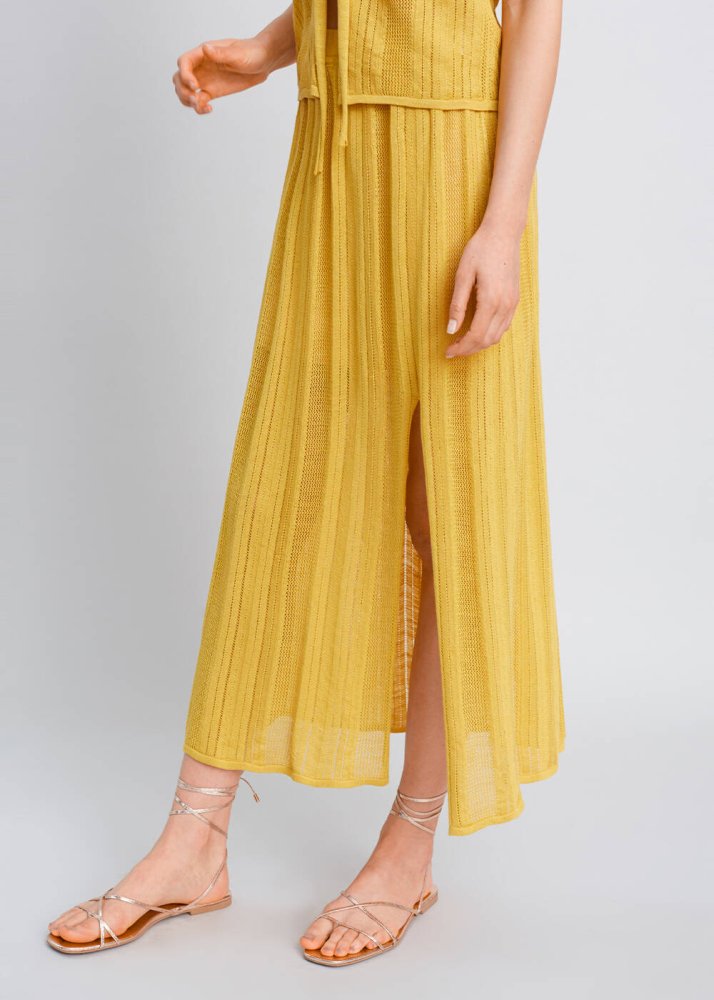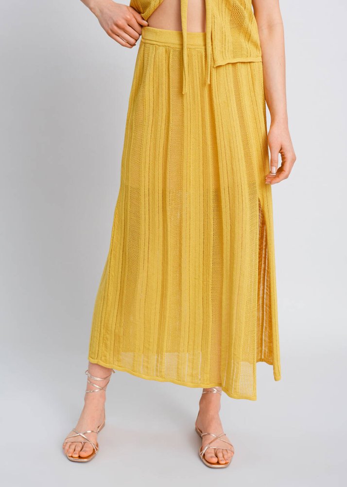 Yırtmaç Detaylı Ajur Örgü Sarı Triko Etek