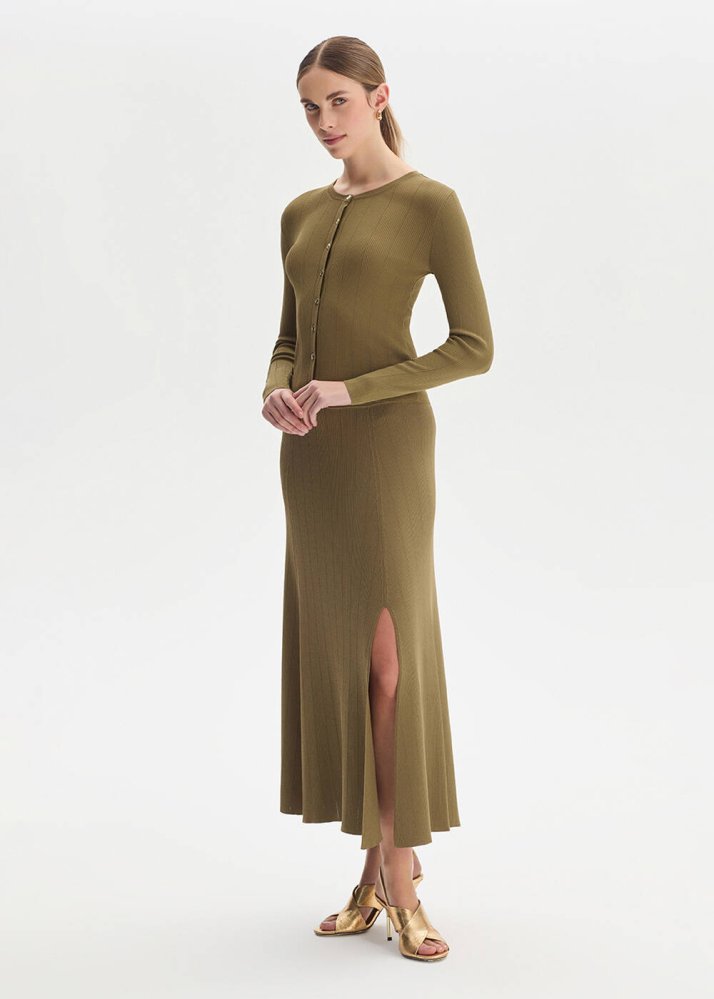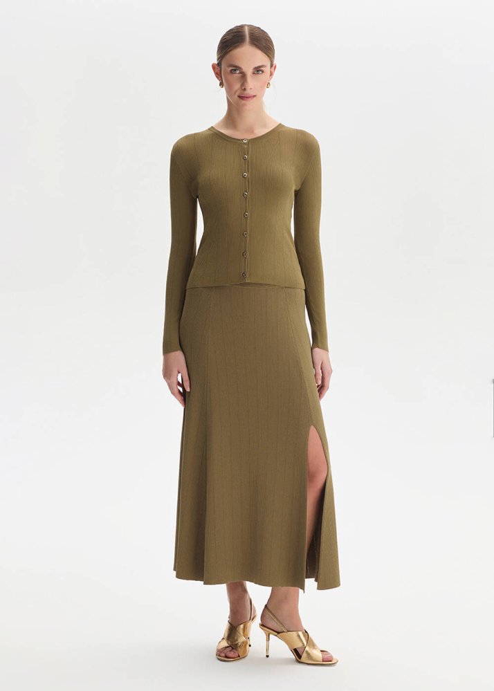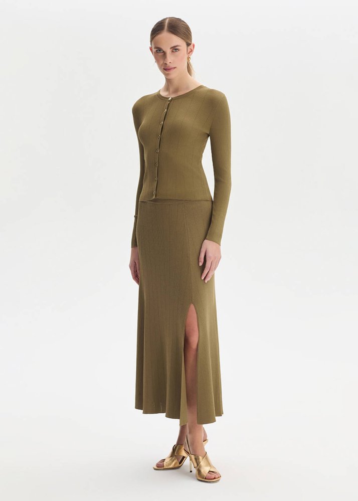 Yırtmaç Detaylı Haki Triko Etek