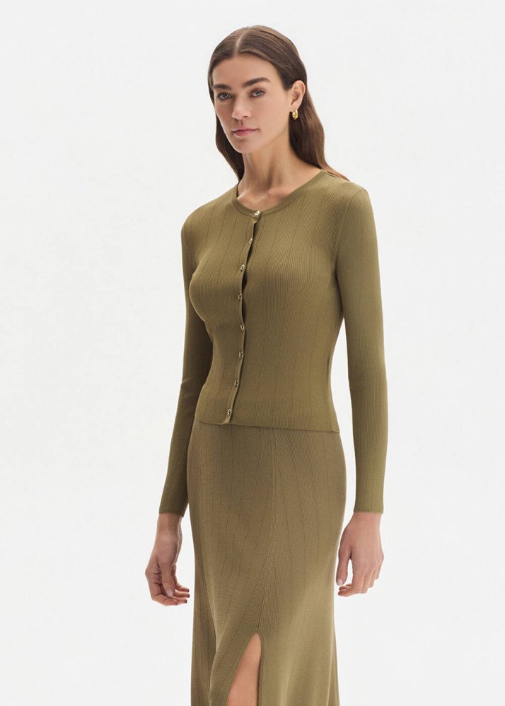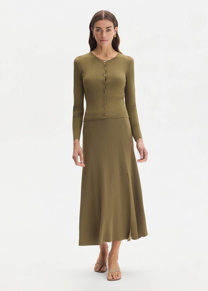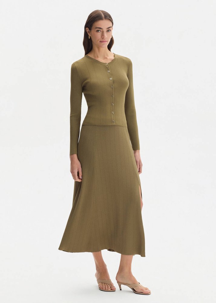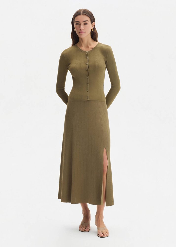 Yırtmaç Detaylı Haki Triko Etek, zarif akışı ve modern siluetiyle öne çıkar. İtalyan iplik ve FSC sertifikalı viskon içeren iplik karışımıyla üretilen tasarım, elastik bel yapısıyla gün boyu konfor sunar. Ajur örgü dokusu yüzeye incelikli bir hareket kazandırırken, yırtmaç detayı eteğe dinamik bir görünüm katar. Triko üst ve hırkalarla kombinlendiğinde dengeli ve sofistike bir stil oluşturur.