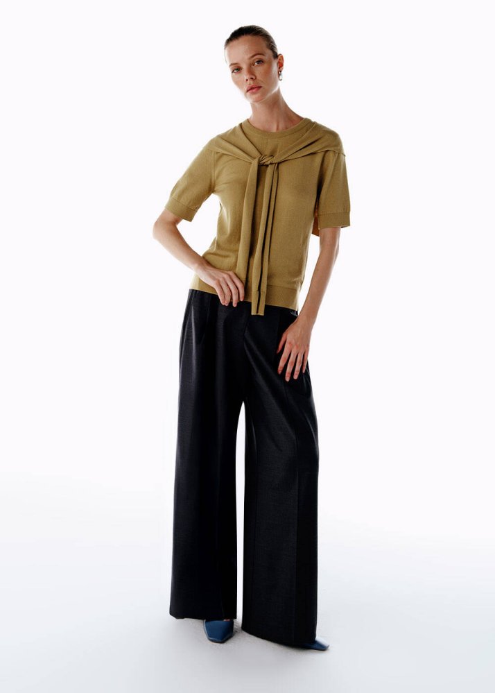 Modern ve rahat bir siluet arayanlar için tasarlanan yüksek bel gri yün pantolon, konforla zarafeti dengeliyor. Yün karışımlı kumaşı sıcak tutarken, elastan içeriği esnek bir hareket alanı sağlar. Palazzo kesimi bacak boyunu optik olarak uzatır, pileli ve ayarlanabilir beli ise form kazandırır. Gri tonu, soft bir zarafet ve her stile kolayca adapte olabilen bir duruluk sunar.