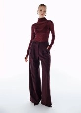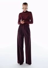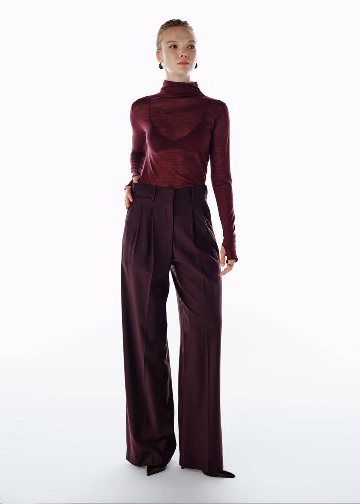 Derin ve sofistike tonu ile yüksek bel yün mürdüm pantolon, gardırobunuzun öne çıkan parçalarından biri. Ayarlanabilir beli ve pile detaylarıyla hem konfor sunar hem de zarif bir siluet yaratır. Palazzo kesimi, hareket özgürlüğü sağlarken modern bir duruş katar. %86 yün, %10 poliamid ve %4 elastan karışımıyla yumuşak dokusu ve hafif yapısı, pantolonu triko üstlerle mükemmel şekilde tamamlamaya olanak verir.