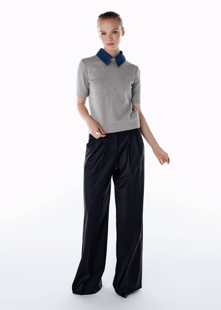 Denım Yaka Detaylı Triko Üst Açık Gri
